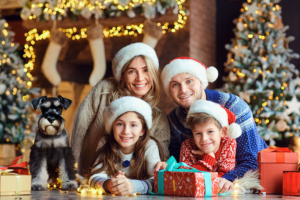 Front: A cheerful scene of a schnauzer lounging by the fire, surrounded by festive pillows and a sparkling Christmas tree. Message reads “It’s the most Wonderful time of the year”.