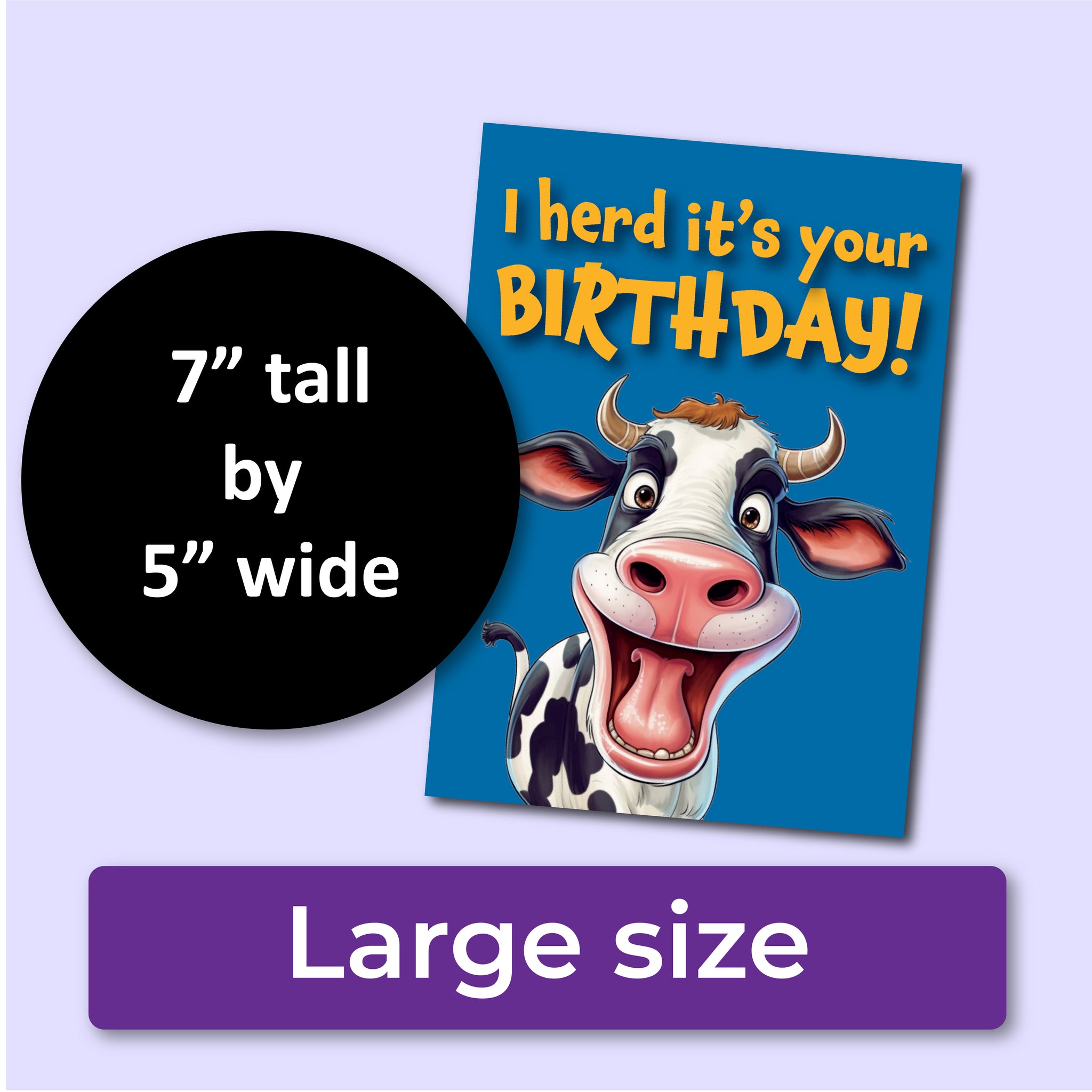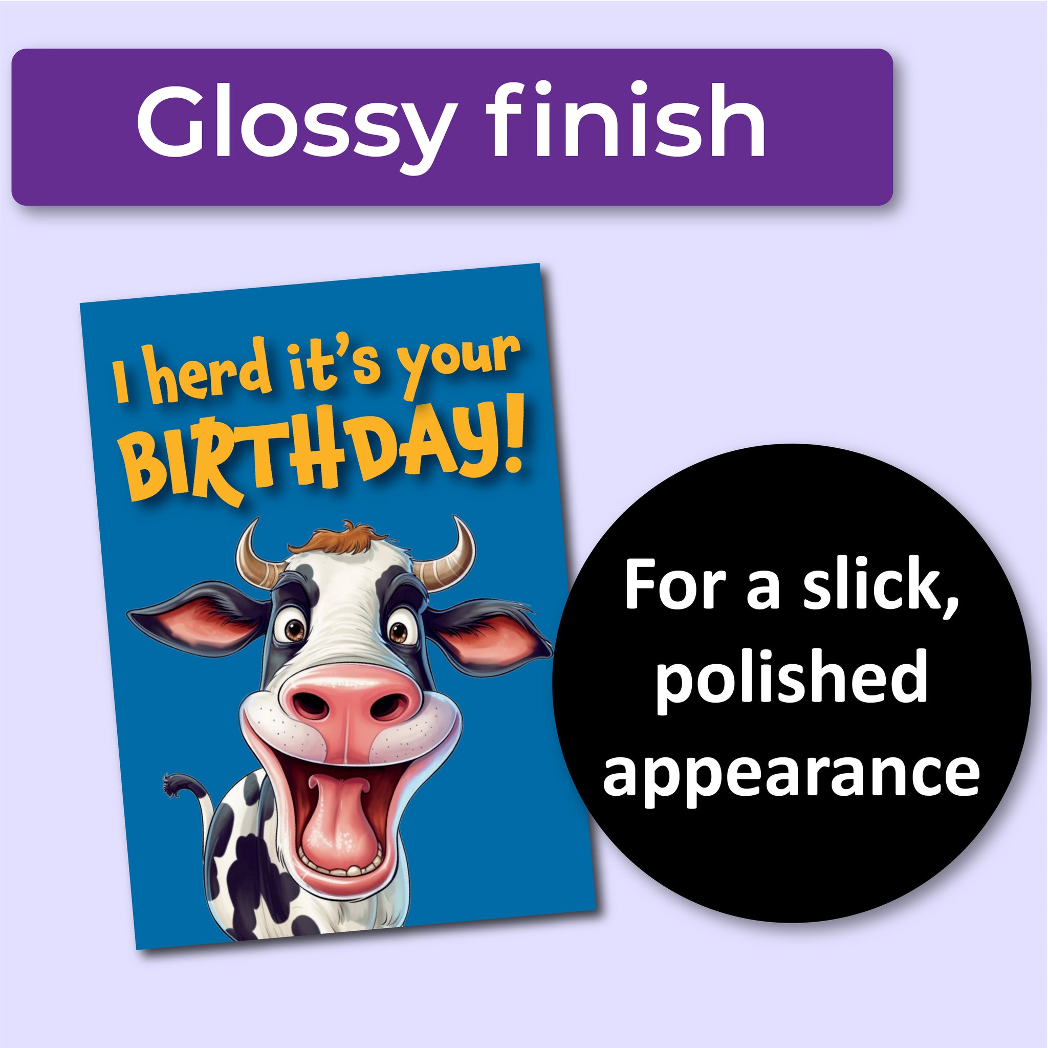 Perfect for animal lovers, this card features a cheerful cow with the playful message, "I Herd It’s Your Birthday!" The glossy exterior and writable interior make it both stylish and functional.