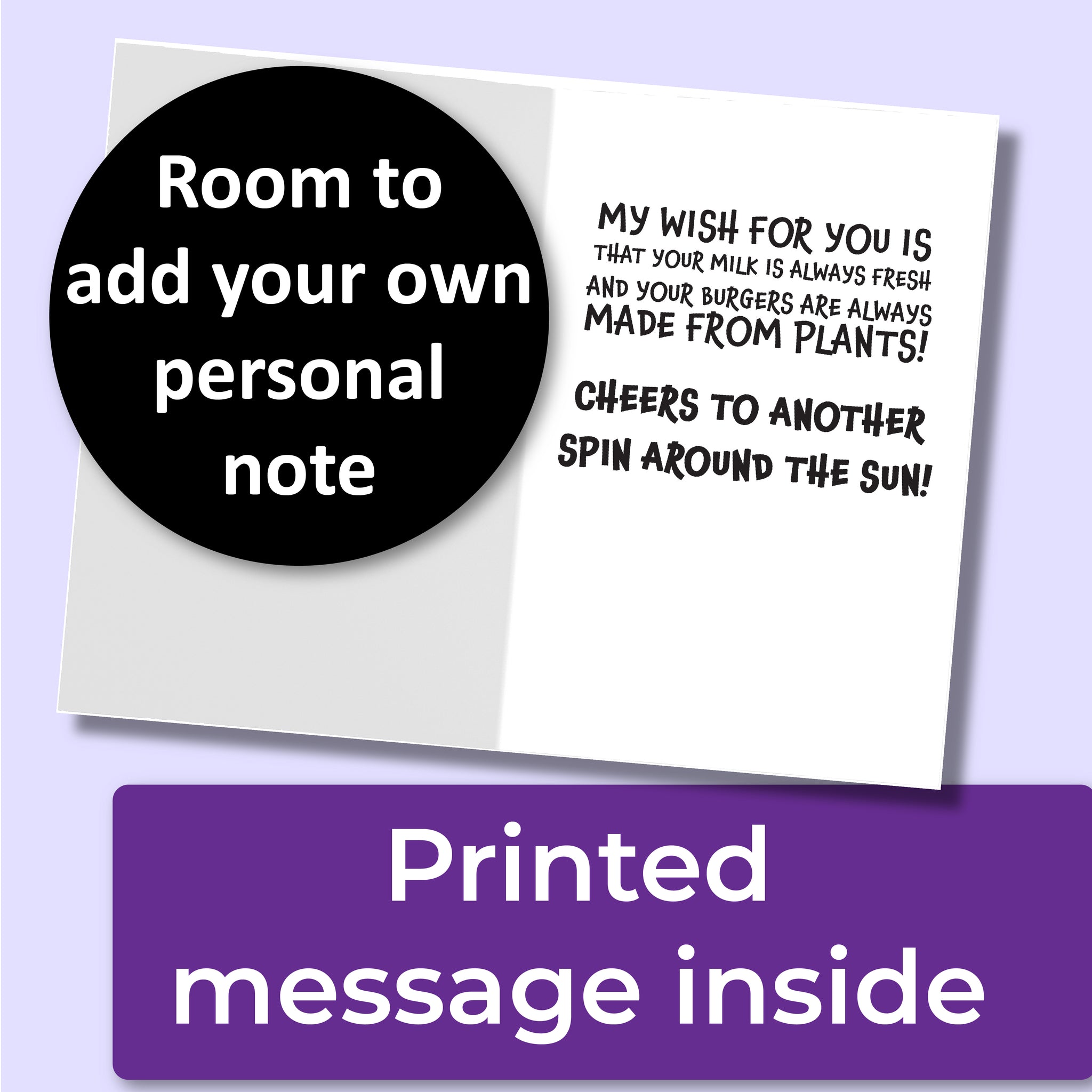 - Inside Message: "My wish for you is that your milk is always fresh and that your burgers are always made from plants! Cheers to another spin around the sun!" – perfect for a good chuckle.