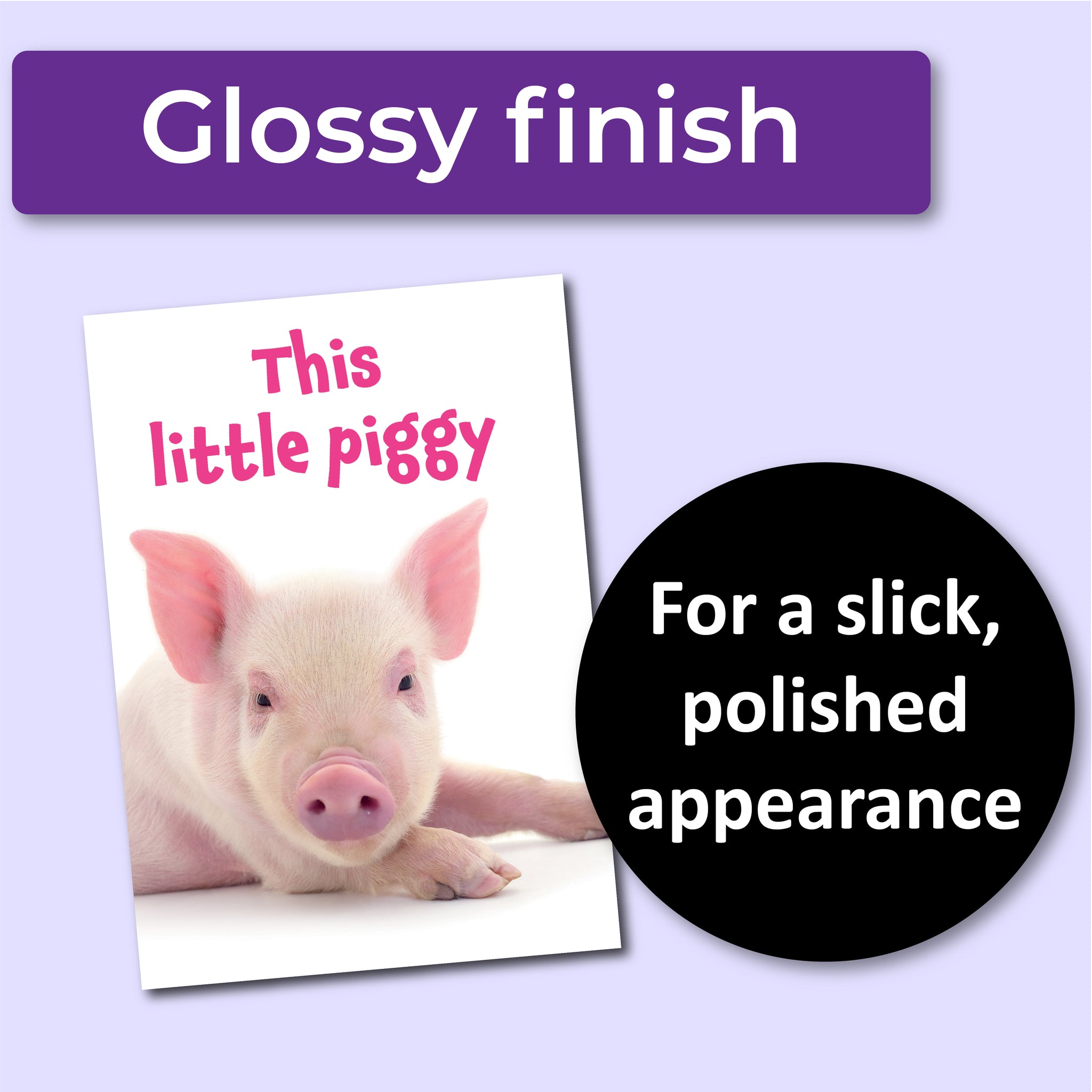 - Design: Adorable piglet image on the glossy front with the fun text "This little piggy."