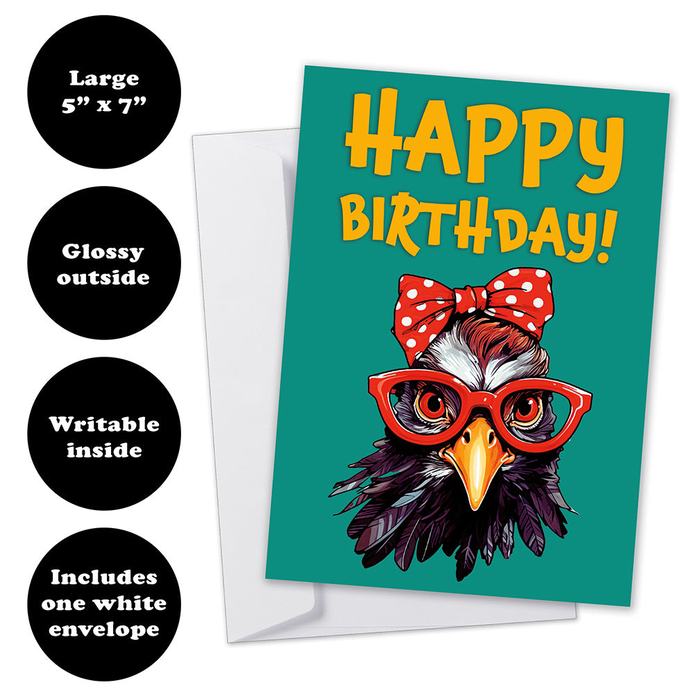 Perfect for animal lovers, this card features a quirky hen with red glasses and a polka dot bow, making it an ideal choice for those who appreciate a good laugh. Whether you're sending it to a friend or family member, this fun card is sure to bring smiles all around! 😄🐔