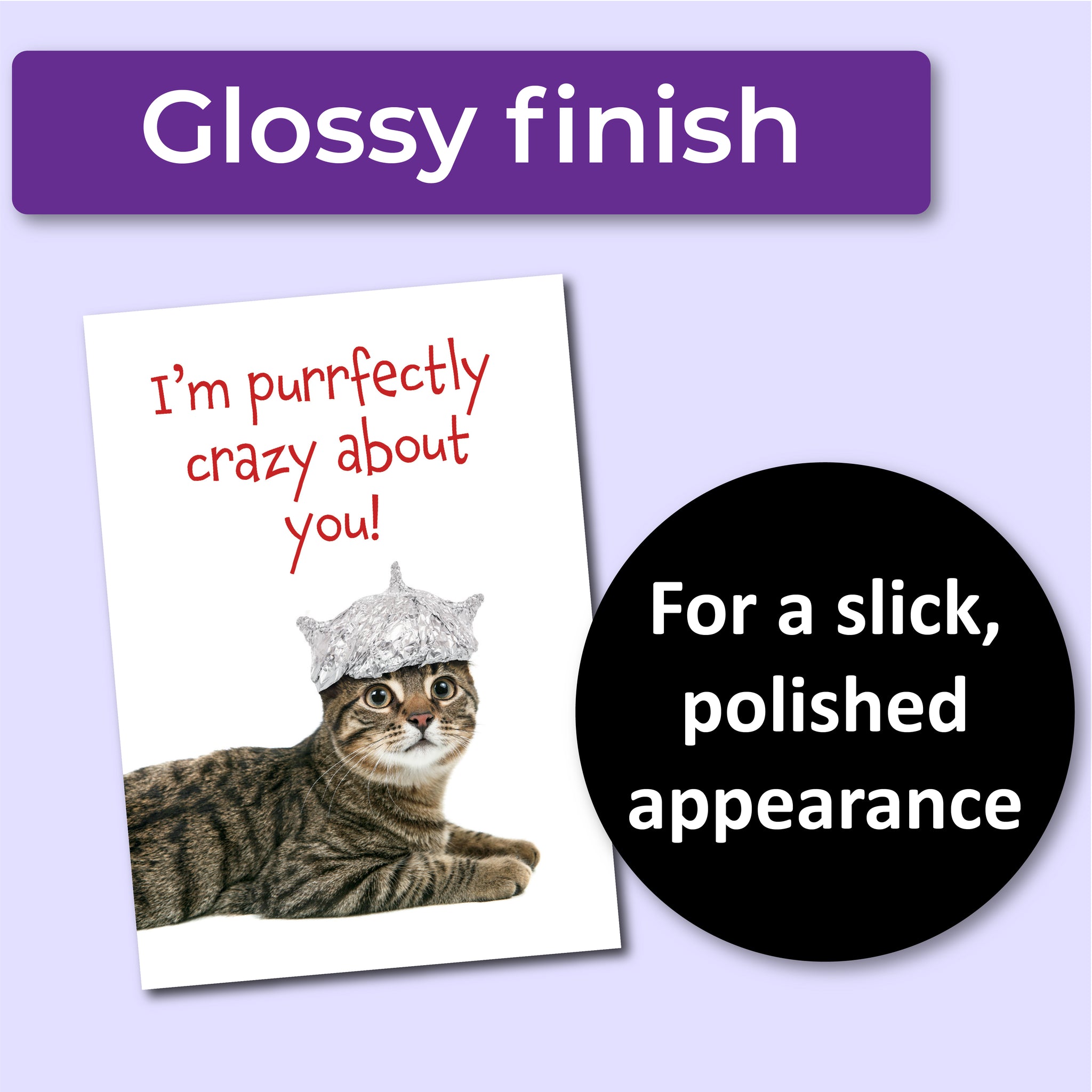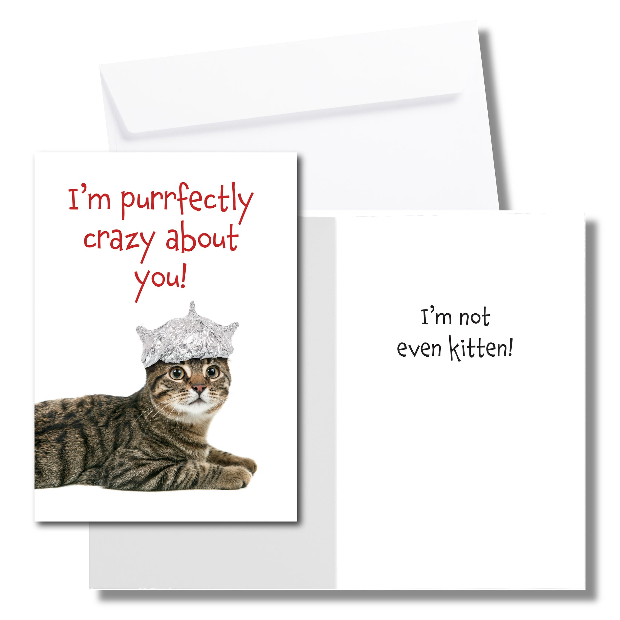 This hilarious cat-themed greeting card is purrfect for animal lovers! Featuring a cute kitty in an aluminum foil hat and the playful message “I’m purrfectly crazy about you!”, this card is guaranteed to bring a smile. The inside follows up with “I’m not even kitten!”—ideal for anyone with a sense of humor.
