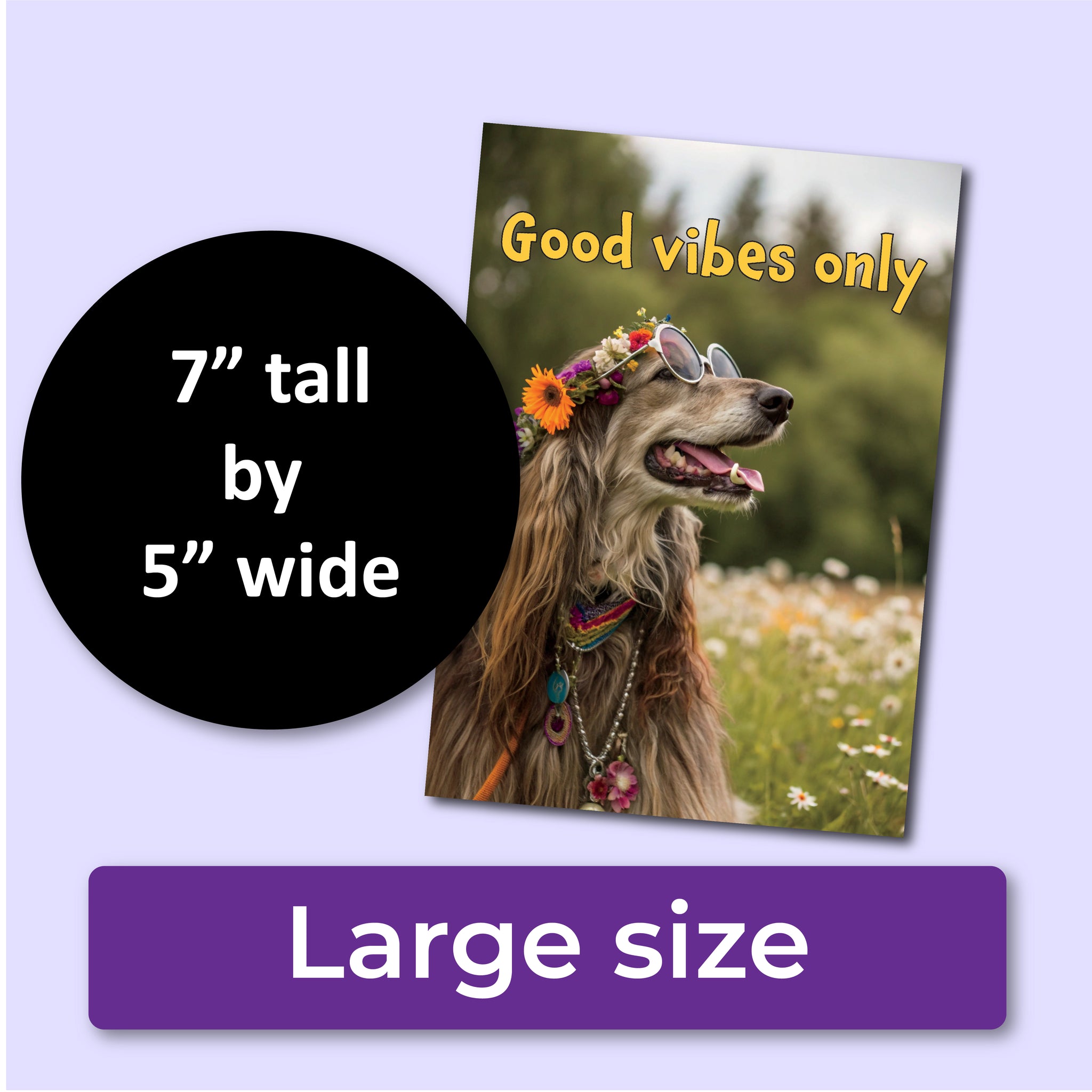 - 🐶 The front has a shaggy, peace-loving Irish setter dressed like a hippie radiating instant charm. The front reads, "Good Vibes Only"