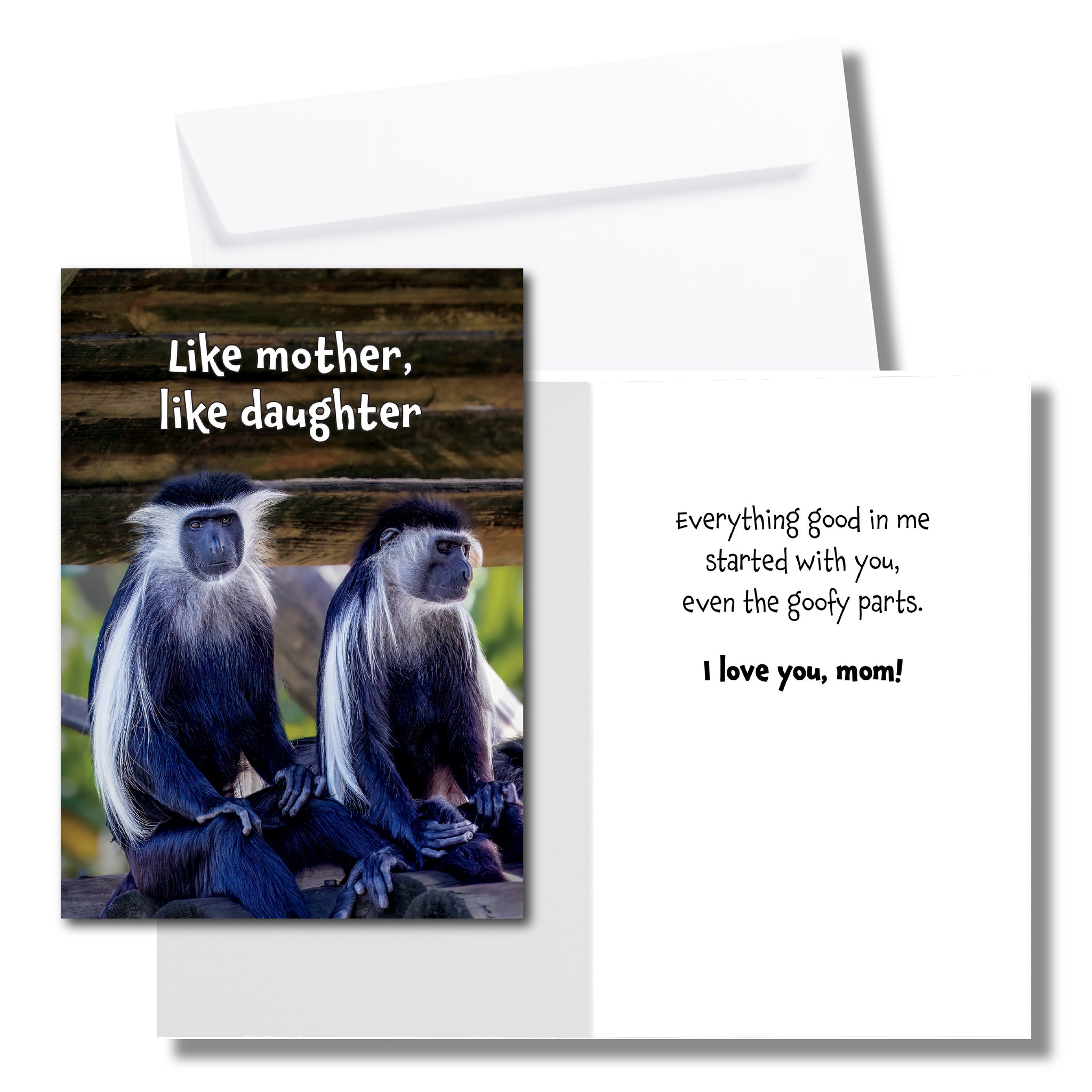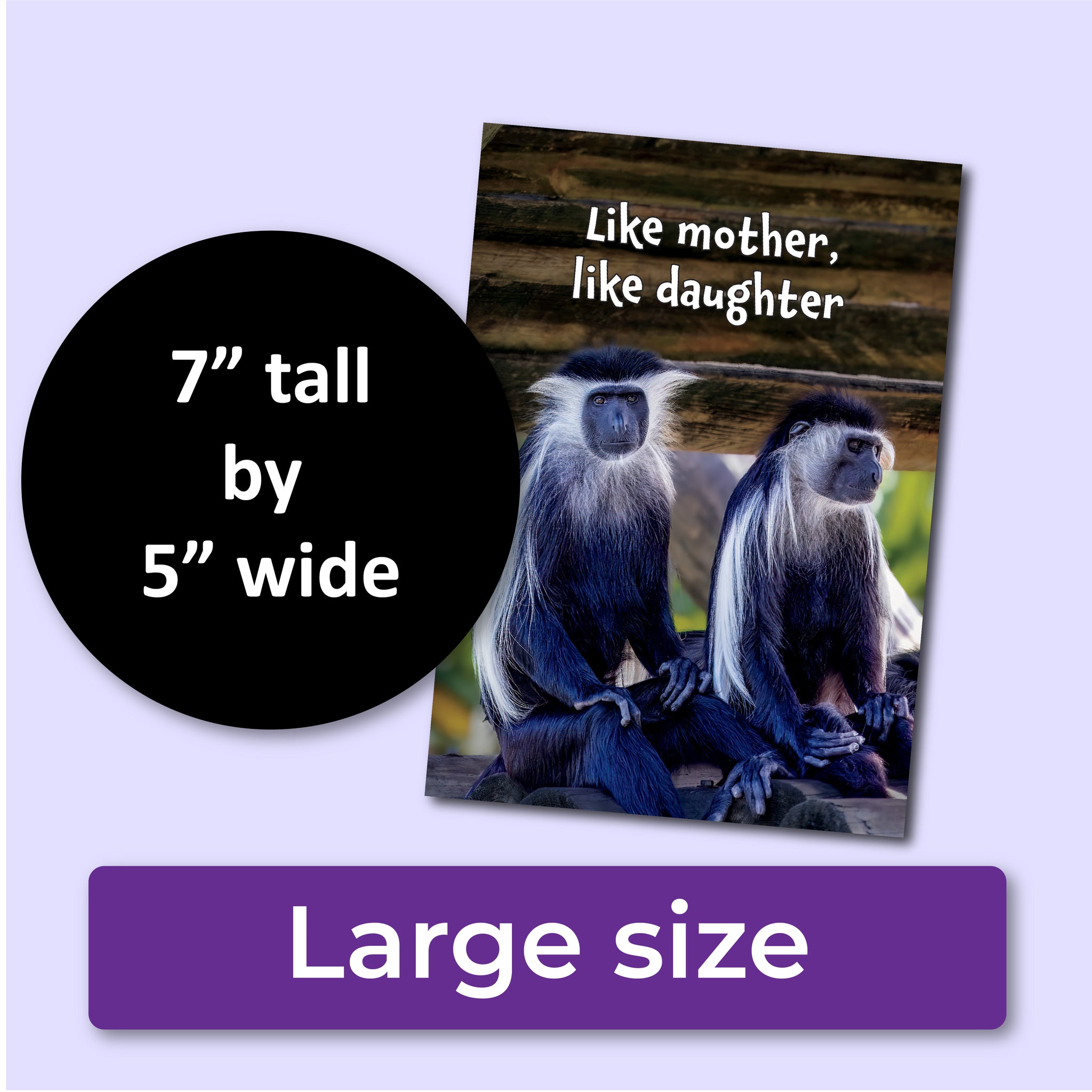 - 🐵 The front has two goofy looking monkeys with the caption, "Like mother, like daughter."