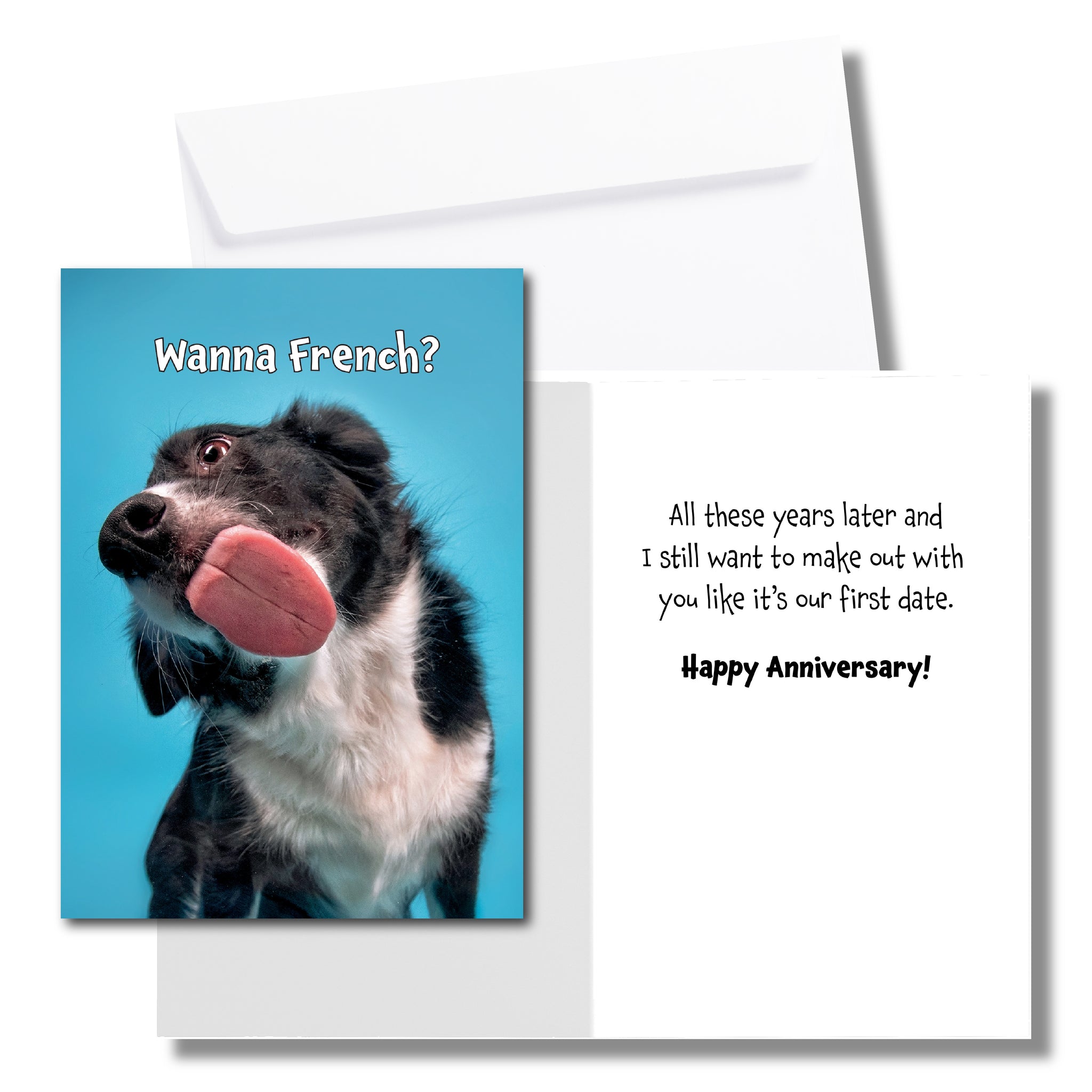 Keep the spark alive with this playful anniversary card that’s equal parts cheeky and heartfelt. The front features a tongue-in-cheek question — “Wanna French?”