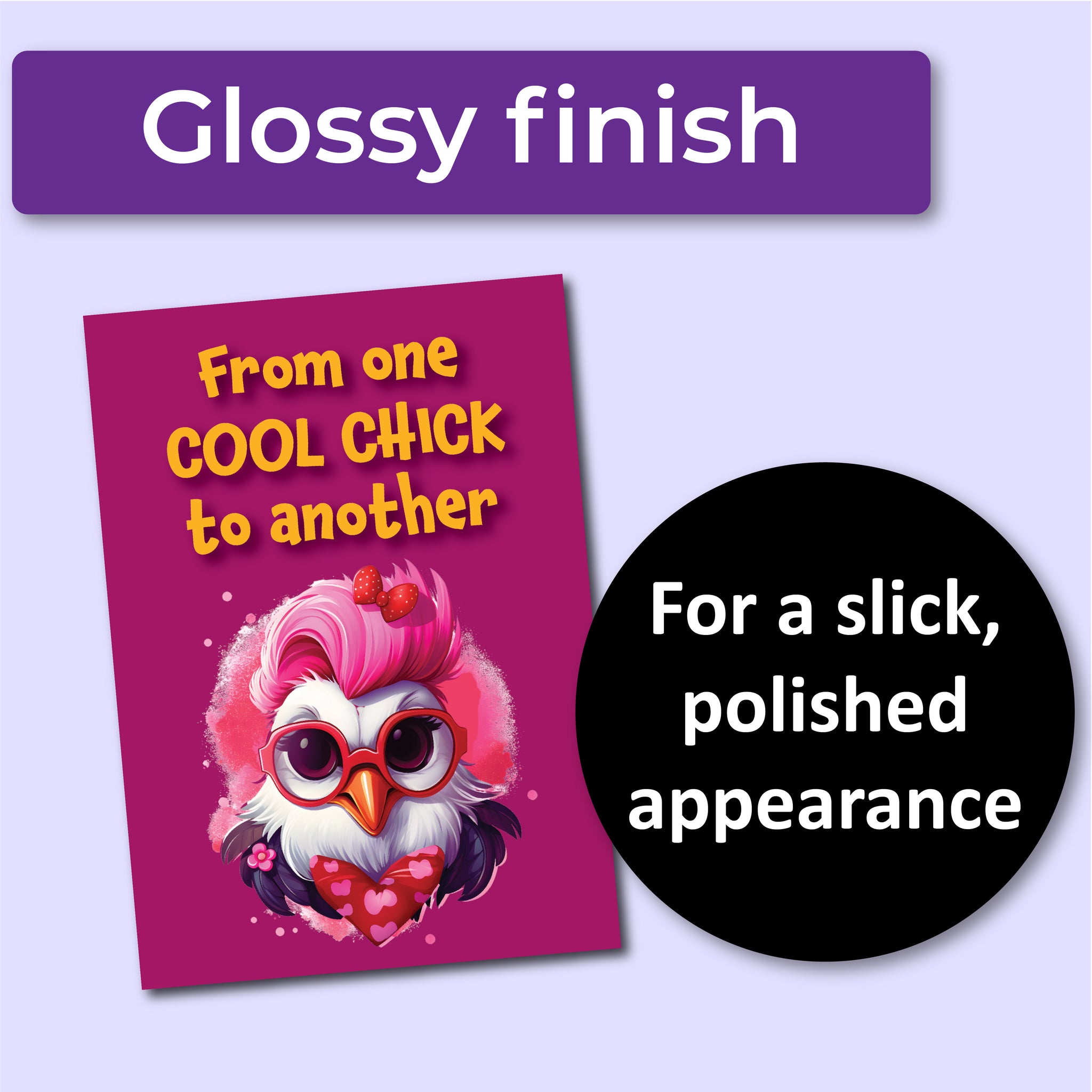 - Playful design: A sassy chicken with pink hair and matching glasses, paired with the message, "From one COOL CHICK to another."