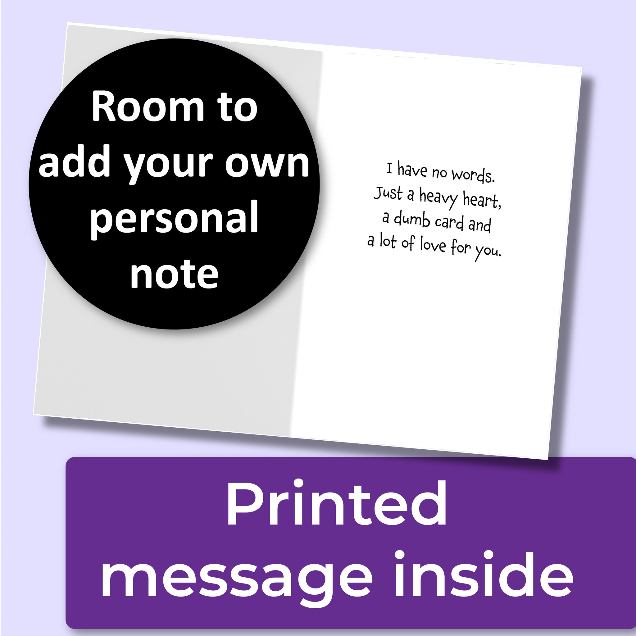 Inside message says: “I have no words. Just a heavy heart, a dumb card and a lot of love for you.”